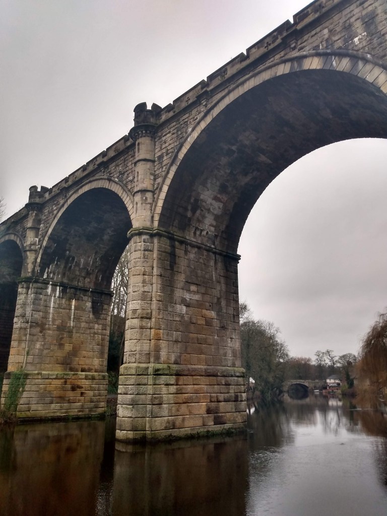 The Knaresborough railway viaduct bridge, seen from the banks of the River Nidd.