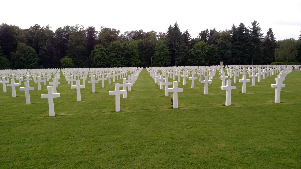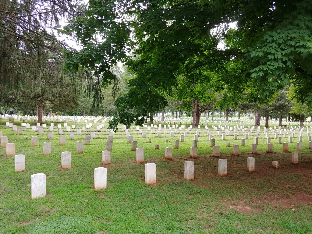 As I walked through Stones River National Cemetery, one of the things that struck me was the regularity of the burials, which you can see in the pictures above. The graves are not haphazard; they are set in lines which form a pattern: each section of graves appears to radiate out from a central point. This point stood out to me, because I’ve seen this arrangement of graves at American military cemeteries before, in Europe. For example, the graves at the Luxembourg American Cemetery, where many American soldiers who were killed in the Battle of the Bulge are buried, are arranged in a very similar pattern.