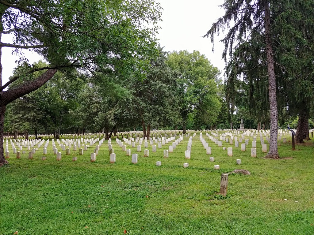 I also found the Stones River National Cemetery very interesting. Following the Battle of Stones River, most of the Union and Confederate dead were quickly buried where they lay on the battlefield. After the war ended, the Union dead were disinterred and reburied in Stones River National Cemetery, which had been established in 1864 by order of Union general George H. Thomas. The Confederate dead, who were not eligible for burial in the national cemetery, were reburied at public cemeteries in Murfreesboro or in their home towns. Between October 1865 and the end of 1866, more than 6,000 Union soldiers were reburied at Stones River National Cemetery. Much of the work of disinterment and reburial was done by soldiers of the 111th United States Colored Infantry.