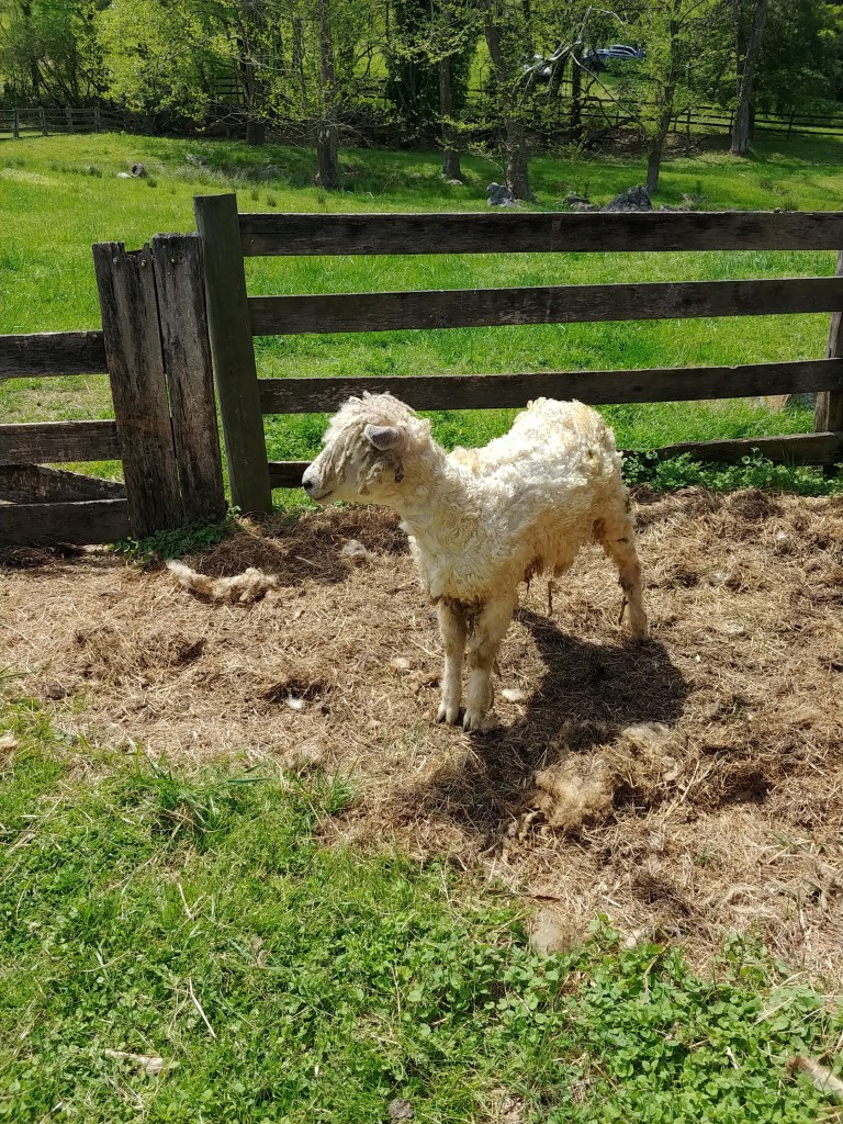 The main house, described as a “saddlebag” style house by the historical marker on site, presumably because there is a main room on either side of the center (marked by the darker brown logs).The kitchen (undergoing preservation work) and outdoor bread oven.A cabin similar to that occupied by the enslaved cook at the plantation. The original cabin was beyond repair by the late 20th century, so this (very similar) cabin was brought in from nearby Greene County. I learned here that the family living at Exchange Place in the 1850s had 8-10 enslaved people, a relatively large number for Northeast Tennessee. The information provided did not explain what crop(s) were grown at this plantation.A view of some of the structures on the property. The entire site was larger than I expected. It also included a barn and two other structures on the opposite site of the (modern) highway.A break from history for cute animals! As part of the garden fair, sheep were being shorn the traditional way – by hand. This sheep has just been freed from its winter coat.