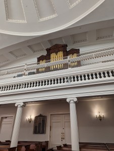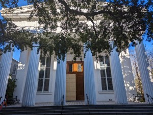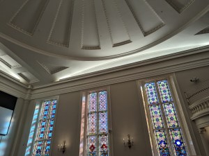 The first synagogue built by the KKBE congregation was completed and dedicated in 1794. It was constructed in the popular Georgian style, and surviving drawings of the synagogue’s exterior reveal that it looked strikingly like a church, complete with a cupola that resembled a spire. My tour guide suggested two possible explanations for this architecture: perhaps, when it came to religious buildings, architects in 1790s South Carolina were only familiar with constructing churches, or the KKBE congregation wanted their synagogue to “fit in,” at least externally, with the prevailing architecture of the city. This first synagogue was destroyed by fire in 1838. In 1841, a second synagogue constructed in the Greek Revival style was dedicated; this is the synagogue still in use by the KKBE congregation today. It is the second-oldest synagogue building in the United States and the oldest in continuous use. The building has been designated a National Historic Landmark and is on the National Register of Historic Places.