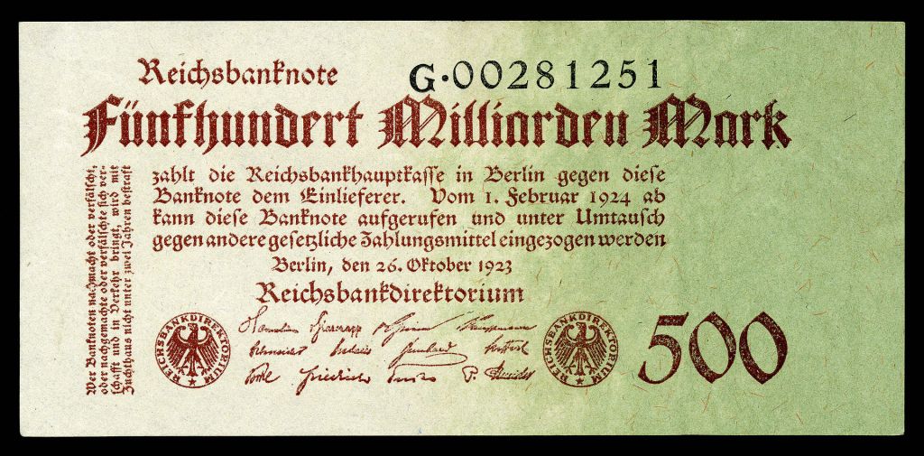 Hyperinflation: The occupation of the Ruhr and the German campaign of passive resistance put further strain on the already-strained German economy. Ever since the end of World War I, inflation had been rampant in Germany as the effects of wartime debt and postwar reparations payments led to an increasing devaluation of the German mark. However, the event that transformed this inflation into a rapid hyperinflation, leading to massive economic collapse, was the occupation of the Ruhr. As mentioned above, the German government decided to finance German workers’ passive resistance in the Ruhr. In order to do this, the German government printed more and more money, leading to massive hyperinflation. The hyperinflation in Germany in 1923 is hard to comprehend, even in the context of inflation and rising prices today. By November 1923, one U.S. dollar was worth around 4.2 trillion (yes, trillion) German marks. Inflation accelerated so rapidly that sometimes banknotes were re-stamped with a new value, rather than printing an entirely new note, enabling a billion-mark note, for example, to quickly become a trillion-mark note.