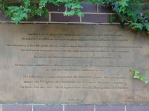 After the failure of the Spartacist Uprising, Luxemburg and Liebknecht went into hiding, realizing that their lives were in danger. Three days after the end of the uprising, on January 15, 1919, Luxemburg and Liebknecht were captured by members of a Freikorps unit while hiding at an apartment in the Wilmersdorf neighborhood of Berlin. No one knows who informed the Freikorps about to Luxemburg’s and Liebknecht’s whereabouts. Luxemburg and Liebknecht were questioned under torture by the Freikorps unit, the leader of which made the decision to summarily execute the two of them. As mentioned at the beginning of this post, Liebknecht was shot near the Neuer See in the Tiergarten; his body was brought to a morgue without identification. Luxemburg was shot, and her body was thrown into the Landwehr Canal, near the spot where her memorial now stands. Several months later, in June 1919, a body believed to be Luxemburg’s was recovered from the Landwehr Canal. Her remains and those of Liebknecht were buried in the Friedrichsfelde Central Cemetery in Berlin, the resting place of many German socialists and communists, including Wilhelm Liebknecht.