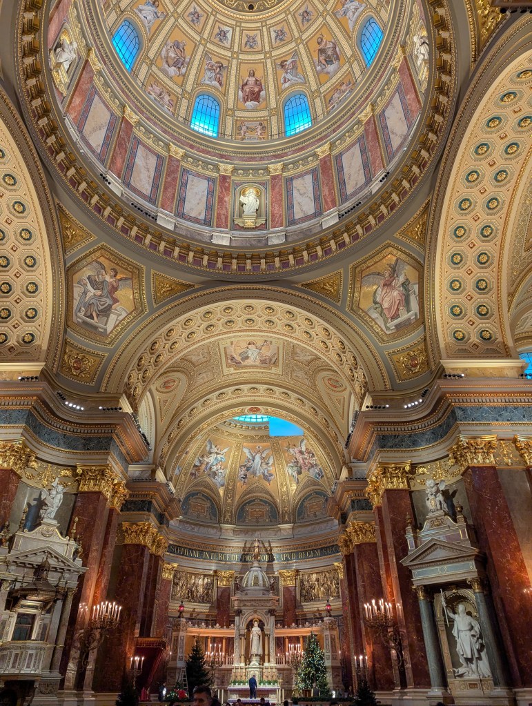 After touring the Dohány Street Synagogue, I also visited St. Stephen’s Basilica, a large Catholic church on the Pest side of the city. The church is named for St. Stephen, who became the first king of Hungary in 1000 and is an important saint in Hungary. St. Stephen’s Basilica was constructed from 1851 to 1905. The interior is extremely ornate, with gold, richly colored marble, mosaics, and more.